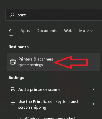 - Open the Start menu, type “Printers & Scanners,” and open the system settings application: