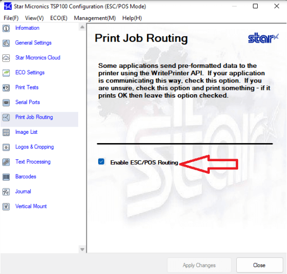 - Once it opens, click the menu option for “Print Job Routing,” check the box for “Enable ESC/POS Routing,” click “Apply Changes,” and then “Close.”