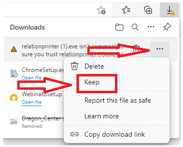 Note: Your computer may flag the last file as a potential threat and block the download. Be sure to click “See more,” then the three dots, followed by “Keep,” and finally “Show more” and “Keep anyway.”