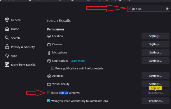 - Uncheck the box for “Block pop-up windows,” then close the settings tab.